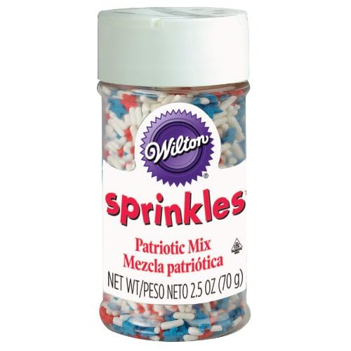 Shake up Patriotic treats with fun colors and designs. Plastic bottles for convenient pouring and storing. Certified Kosher. 2.5 ounce bottle. Simply frost your cake, cupcakes, or cookies and sprinkle these on to add some color and fun. Try using a stencil to make fun shapes using your Wilton sprinkles. Made in USA.